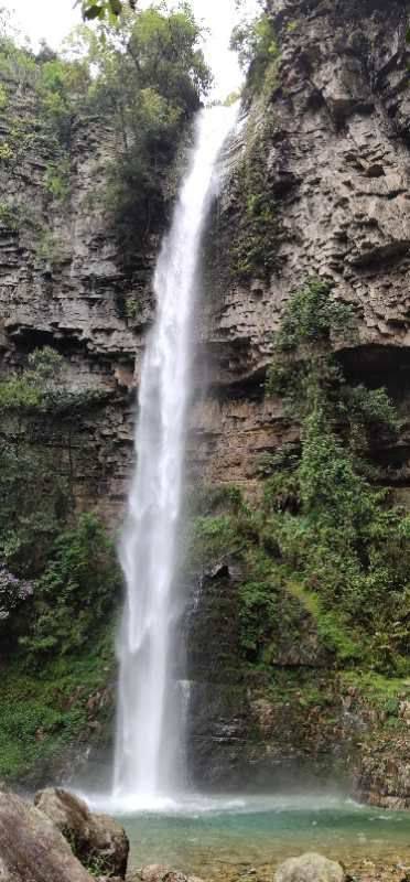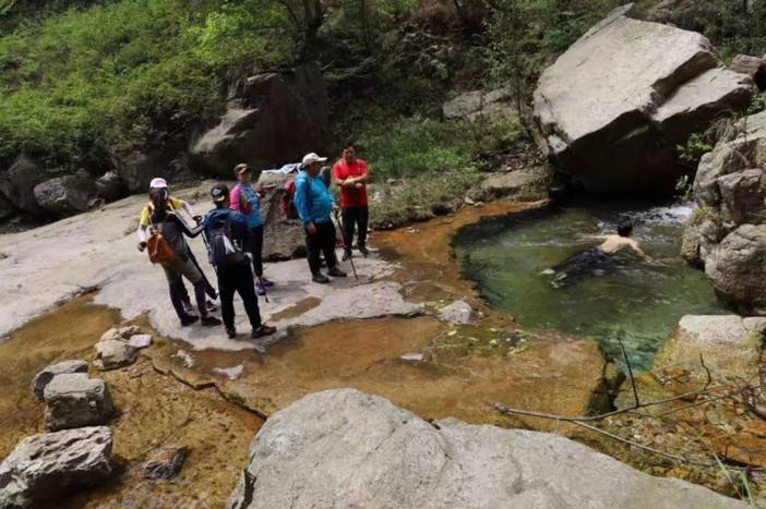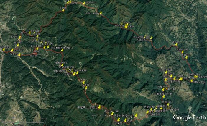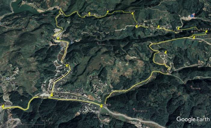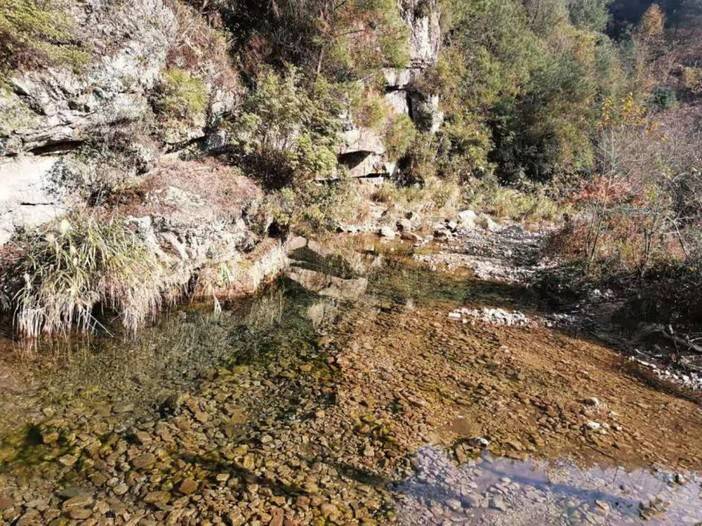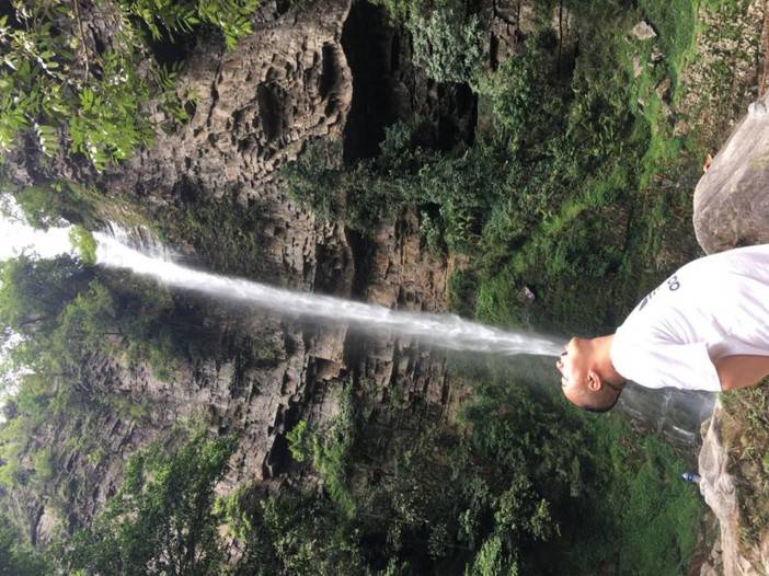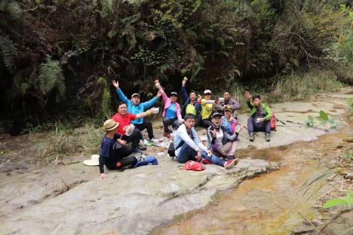 我和喜多赛道规划李森林、独山云峰跑团团长刘智、龙局(龙再钦)、群主周明丽、团员三爷(彭铭德)、彬哥(黄福彬)、王焕堂……以及众多云峰队友,在一次次的热烈讨论后,终于在今年三月,开始了第一次探线。在龙局的带领下,我们从净心谷出发,经过雄伟的水司楼,路过一个叫杨六郎的寨子。一路沿着清澈如玻璃般的小河水流,寻找已经被草木和时光湮没了的古驿道。翻山越岭,有遗世独立的古老村落,有让人不由自主就想跳下去的碧绿的清澈见底的水潭,幽深氤氲的峡谷、层层叠叠的茶山,如龙般倾泄而下的水柱,秀美的夹逢岩,威严的将军岩,不为人知的美景,时时让我们惊叹不已。