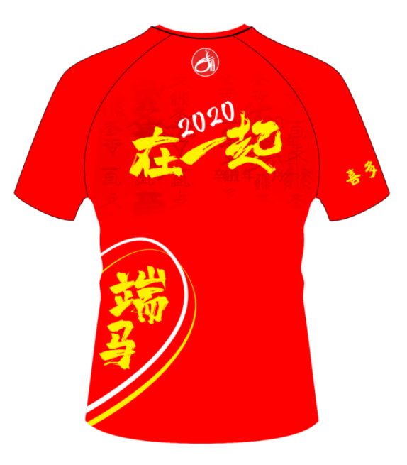 衣服采用国旗色,大红底色,黄色线条和文字,那是对伟大祖国的热爱。和奖牌呼应的水书文字。前后拼接而成的心形图案,2020,让我们深深的意识到,我们绝不仅仅是单独的存在。